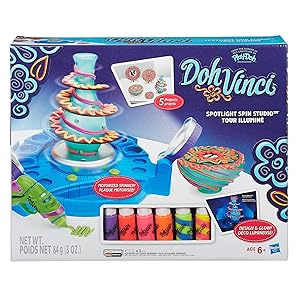 Note: Packaging slightly Damaged Product Description: Motorized spinning studio brings your DohVinci designs to new dimensions 5 light modes to display your designs in a spectacular lightshow 2 Blendables Deco Pop tubes create bold 3D lines with wild multicolor effects You can also spin the studio by hand to control the speed Includes light-up studio, turntable plate, 5 projects, cardboard attachments, Styler, 6 Deco Pop tubes, and inspiration guide Corporate Social Responsibility Hasbro is committed to being an ethical and responsible company and is a recognized toy industry leader in the areas of product safety, environmental sustainability, ethical sourcing and philanthropy. DohVinci Spotlight Spin Studio Creativity takes center stage with a unique spin on DohVinci crafting! Now DohVinci designers have another awesome way to decorate 3D or flat projects on the motorized spinning turntable. With a Styler, 4 Deco Pop tubes, and 5 projects, this complete kit provides so many awesome ways to get creative. And with 5 different light modes, every masterpiece can be its own dazzling display! Creativity takes center stage with this unique spinning art studio. Five light modes to display your designs in a spectacular lightshow. Comes with 5five unique projects: 2 vases, 1 frame, and 2 art boards. Spinning the studio by hand is also an option to control the speed. Two Blendables Deco Pop tubes create bold 3D lines with wild multicolor effects. Spin, Squeeze, Design... Turn arts and crafts time into a show-stopping experience with a fun and easy way to get creative. To get started, load a Deco Pop tube into the Styler and place a flat or 3D project on the turntable. Power on the spinner, then aim, squeeze, and design with the Styler! Try different combinations of dots, lines, zigzags, and other shapes to create awesome pictures and patterns. Blendables Deco Pop tubes add extra pizzazz with funky multicolored swirls! DohVinci, Play-Doh, and all related properties are trademarks of Hasbro. And Let Creativity Shine This epic art station wouldn't be called the DohVinci Spotlight Spin Studio if it didn't have fun light effects! Once you're done creating with the Styler and Deco Pop tubes, the turntable makes a great place to keep and display your work with a variety of flashing and stable lights. Just one button toggles through 5 different light modes to let DohVinci designers show off their creations in all kinds of ways. Hint - there's a stable white light that can also help brighten up the workspace while designing. A Little Bit More About DohVinci Designs Created by the makers of Play-Doh modeling compound, DohVinci arts and crafts toys let kids decorate and personalize their worlds in so many colorful ways. Unlike with most paints or markers, don't worry if you make a mistake. The unique design compound can be adjusted and wiped away before it firms up. It's truly a customizable experience. Includes Includes light-up studio, turntable plate, 5 projects, cardboard attachments, Styler, 6 Deco Pop tubes, and inspiration guide.